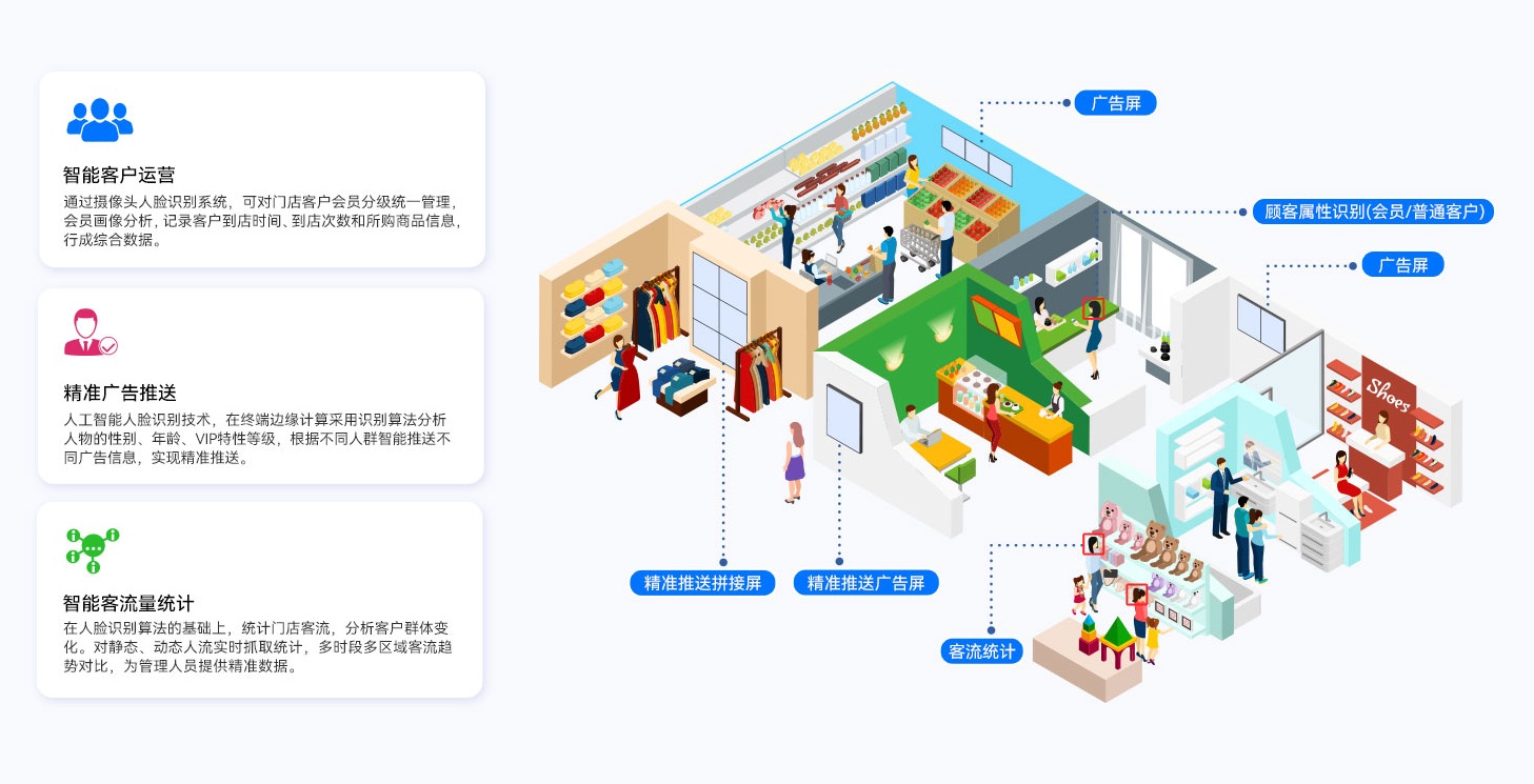星空电竞GDSM-ES智能零售管理系统还可实现宣传推广内容的精准推送,高效触达。系统融合人工智能技术,采用专业的人脸识别算法,通过终端接入摄像设备与AIOT设备,自动识别不同的物体、动作和行为,形成人物画像,为广告屏幕的内容推送提供数据支持,实现精准营销。同时还可以提供客流统计和客群分析功能,为零售客户提供精准的门店数字化运营管理方案。