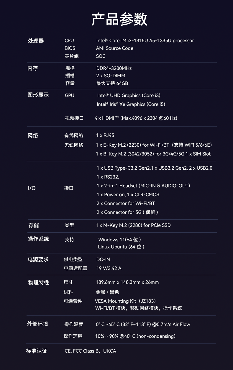星空电竞科技D613采用英特尔Raptor Lake酷睿i3-1315U/i5-1335U 处理器,作为一款性能强悍的主机,它的TDP仅15W,能有效降低能耗,延长电池寿命。在内存方面,D613采用2 x SO-DIMM DDR4-3200 MHz,最大可达64GB,并配备1 x M-Key M.2 (2280) for PCIe SSD。