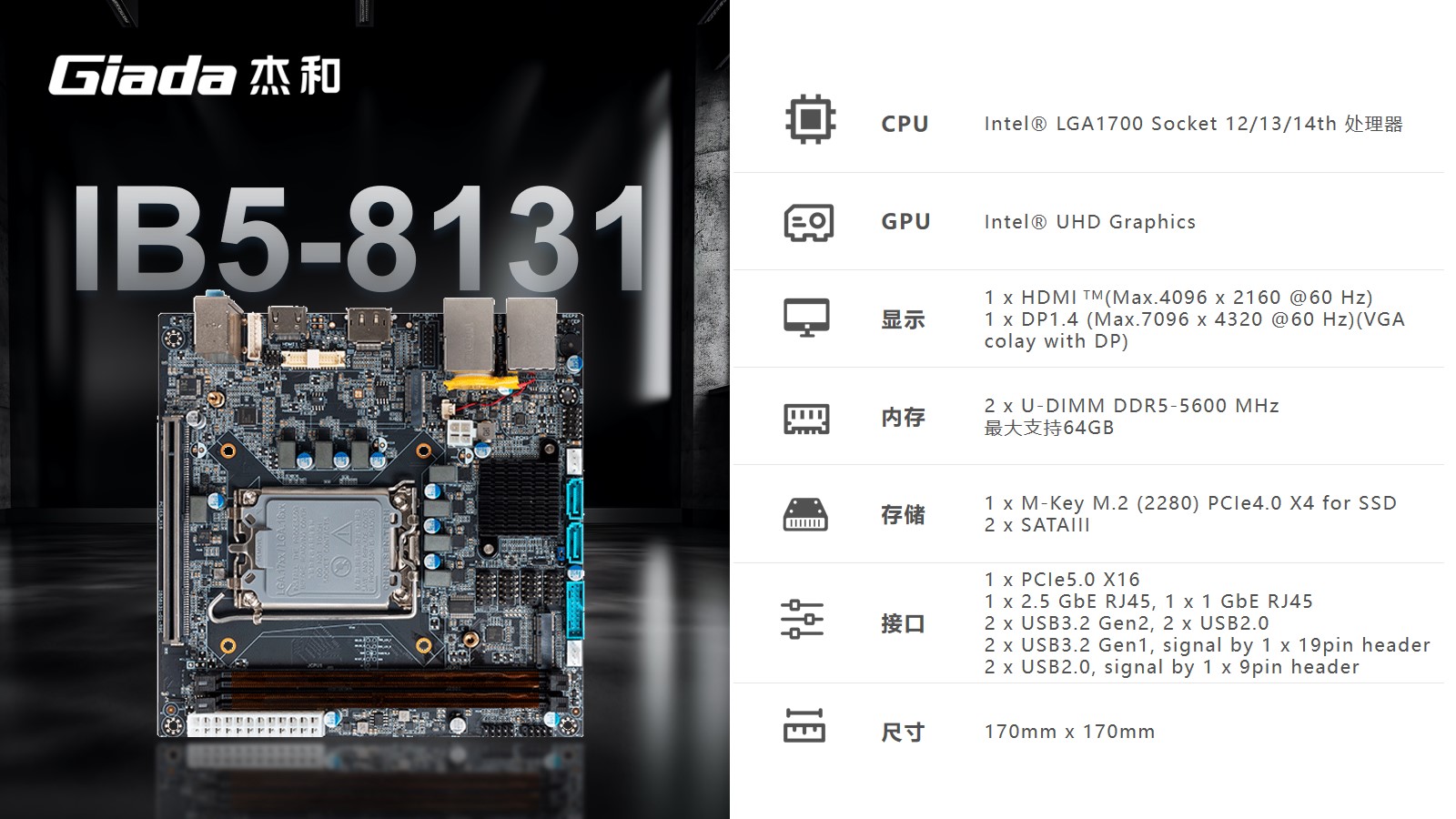 星空电竞Mini-ITX主板IB5-8131采用Intel® B760芯片组,支持Intel® LGA1700 Socket第12/13/14代CPU。支持1 x HDMI (Max.4096 x 2160 @60 Hz);1 x DP1.4 (Max.7096 x 4320 @60 Hz)(保留 VGA位置)。