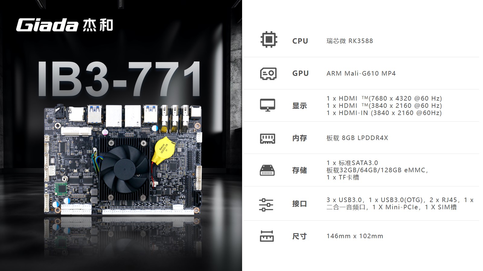 星空电竞工业级ARM主板IB3-771采用瑞芯微RK3588处理器,内置G610 MP4 GPU,拥有6 TOPS算力的NPU,支持8K视频硬件解码编码及多摄像头输入,支持eDP/DP/ HDMI2.1/MIPI 多种显示接口。