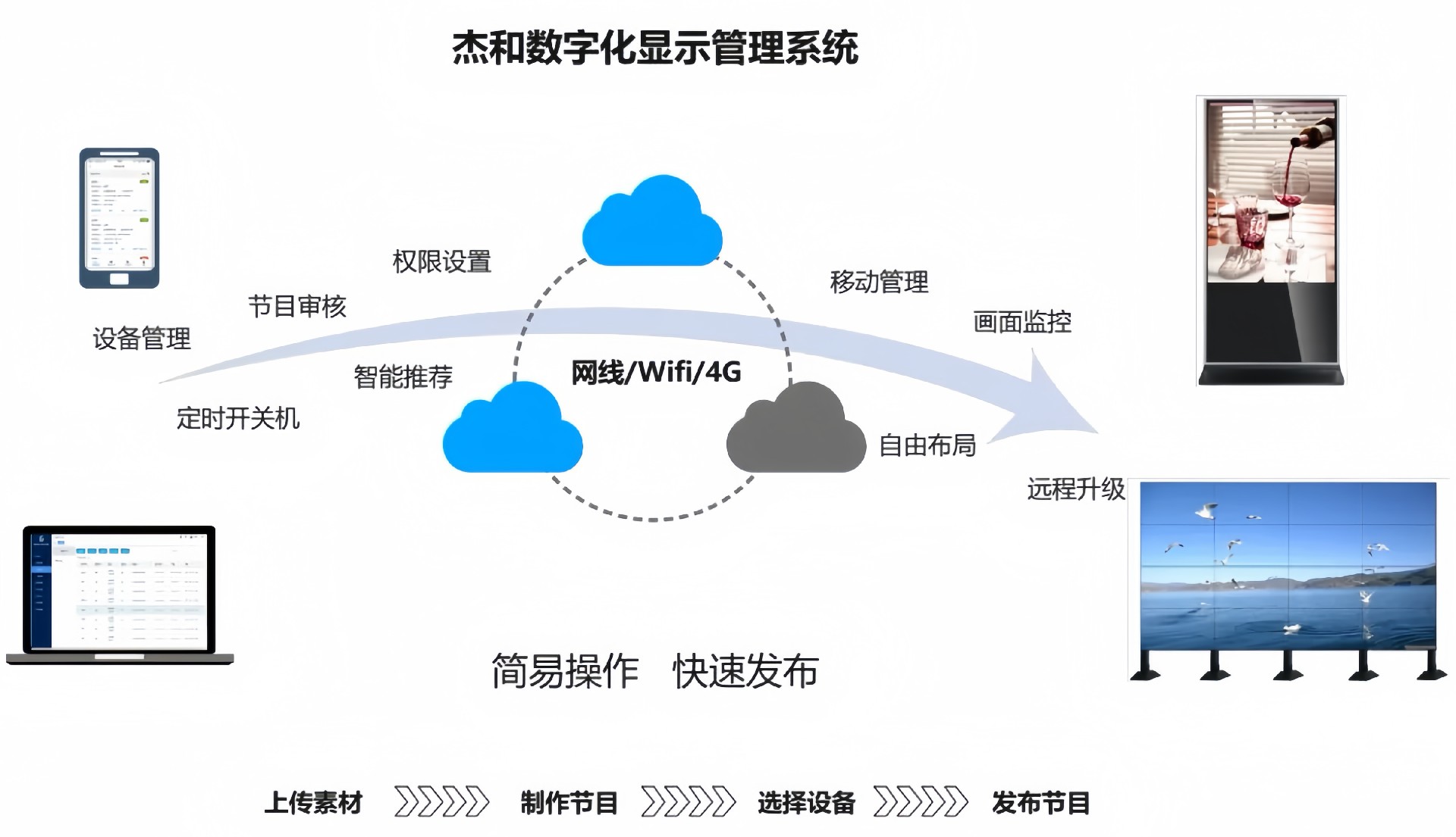 目前星空电竞科技GDSM-ES系统覆盖市场上多形态网络智能显示终端,满足行业全产品业态需求,如广告机、LED显示屏、LCD拼接屏 、普通液晶电视等各种显示终端,广泛用于广告宣传、通知公告、指示引导。
