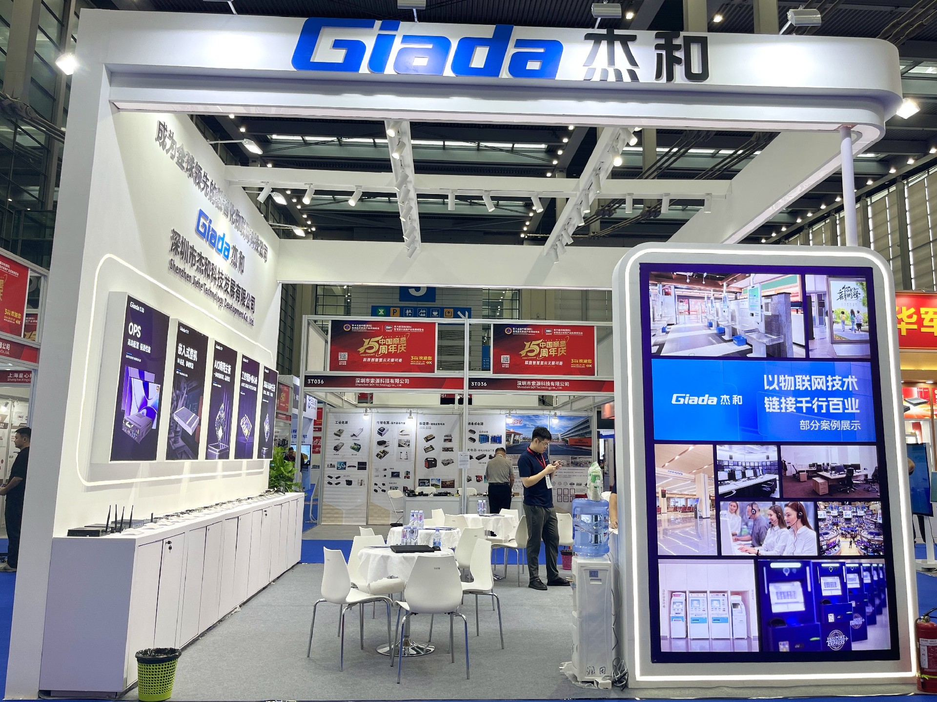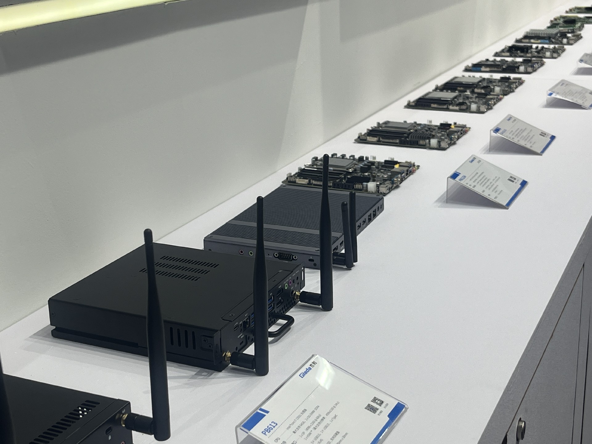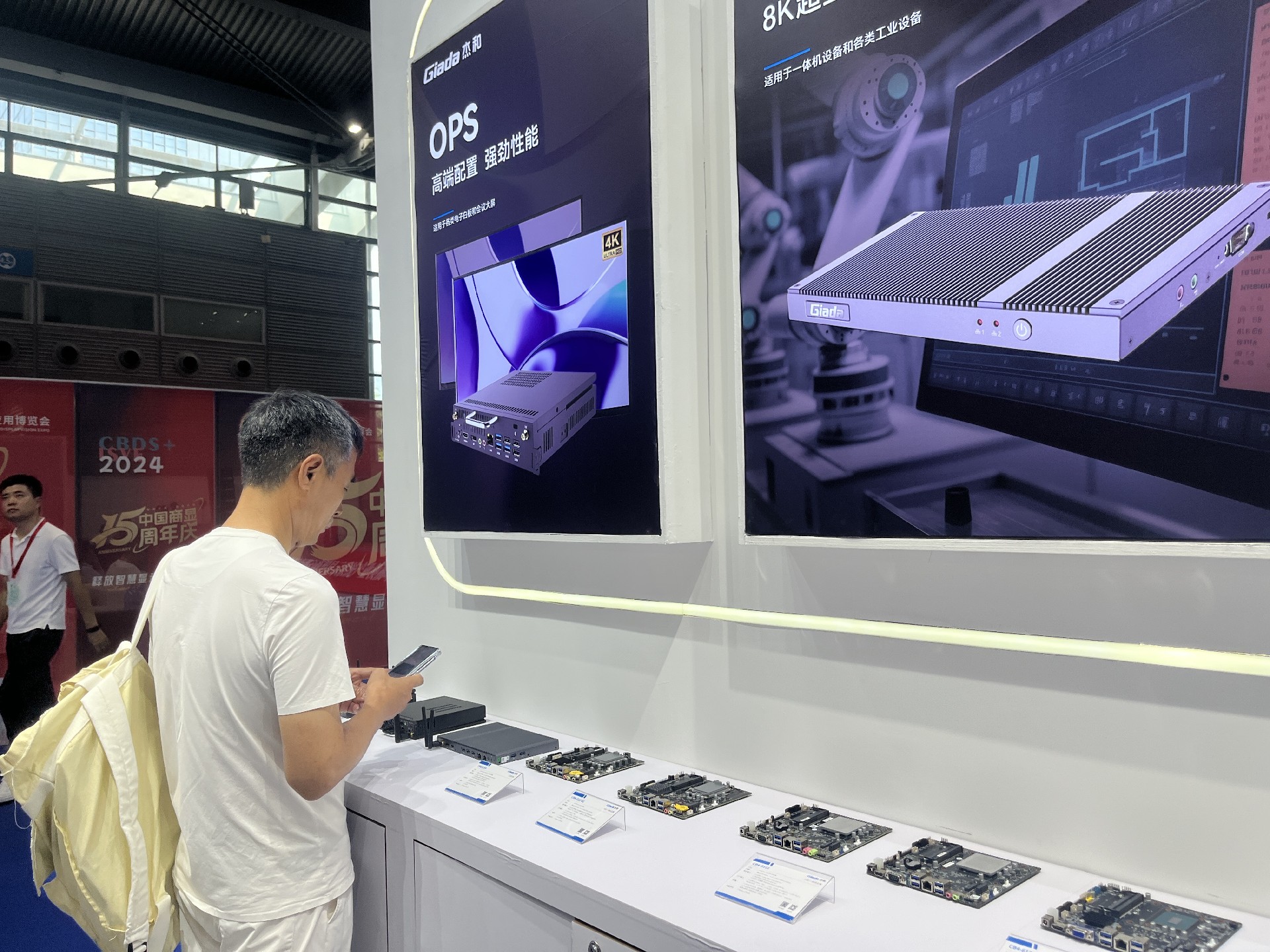 星空电竞科技展位放置在c位的明星产品和最新产品吸引了众多参观者的目光。展台下方整齐排列着公司的产品,包括主板、嵌入式整机、OPS等,这些产品不仅适用于商业展示领域,还广泛应用于工业、制造业和教育业等多个行业。