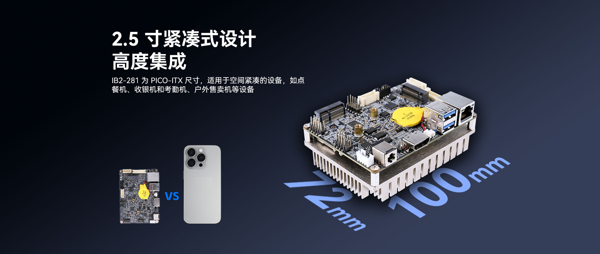 无风扇嵌入式主板去掉了风扇这一易损部件,消除了因风扇故障引发的系统问题,提高了系统的稳定性和可靠性。它采用了高度集成化的设计,体积更为小巧,如星空电竞科技Pico-ITX主板IB2-281,其2.5寸紧凑式设计,适用于点餐机、收银机和户外售卖机等空间有限的应用场景。这种主板通常具备低功耗的特性,减少了能源消耗,也降低了发热。而且,它的稳定性极佳,能适应各种复杂环境。