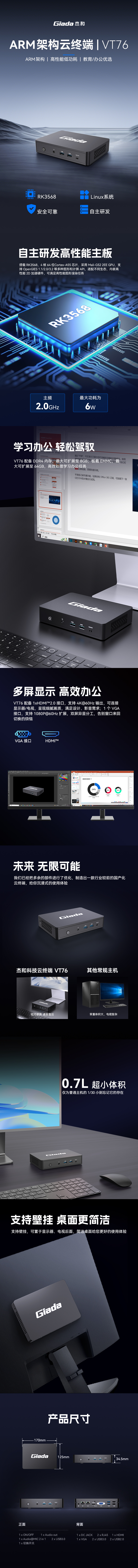 星空电竞科技ARM云终端——VT76,搭载瑞芯微RK3576 4核64位处理器,2.0GHz主频,6W功耗。