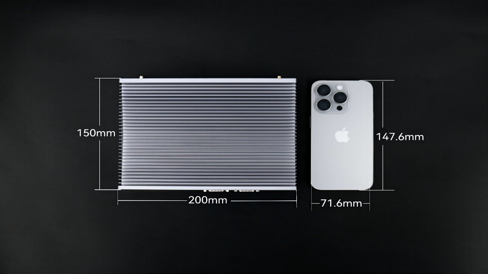 没有了风扇这一部件,体积也更为小巧,能轻松嵌入各类设备或狭小空间,完美贴合特定场景需求,例如:星空电竞AE613,其三围尺寸是200mm x 150mm x 50mm,与iphone15的尺寸对比,宽度仅比其高度多2.4毫米,体积仅有1.5L。