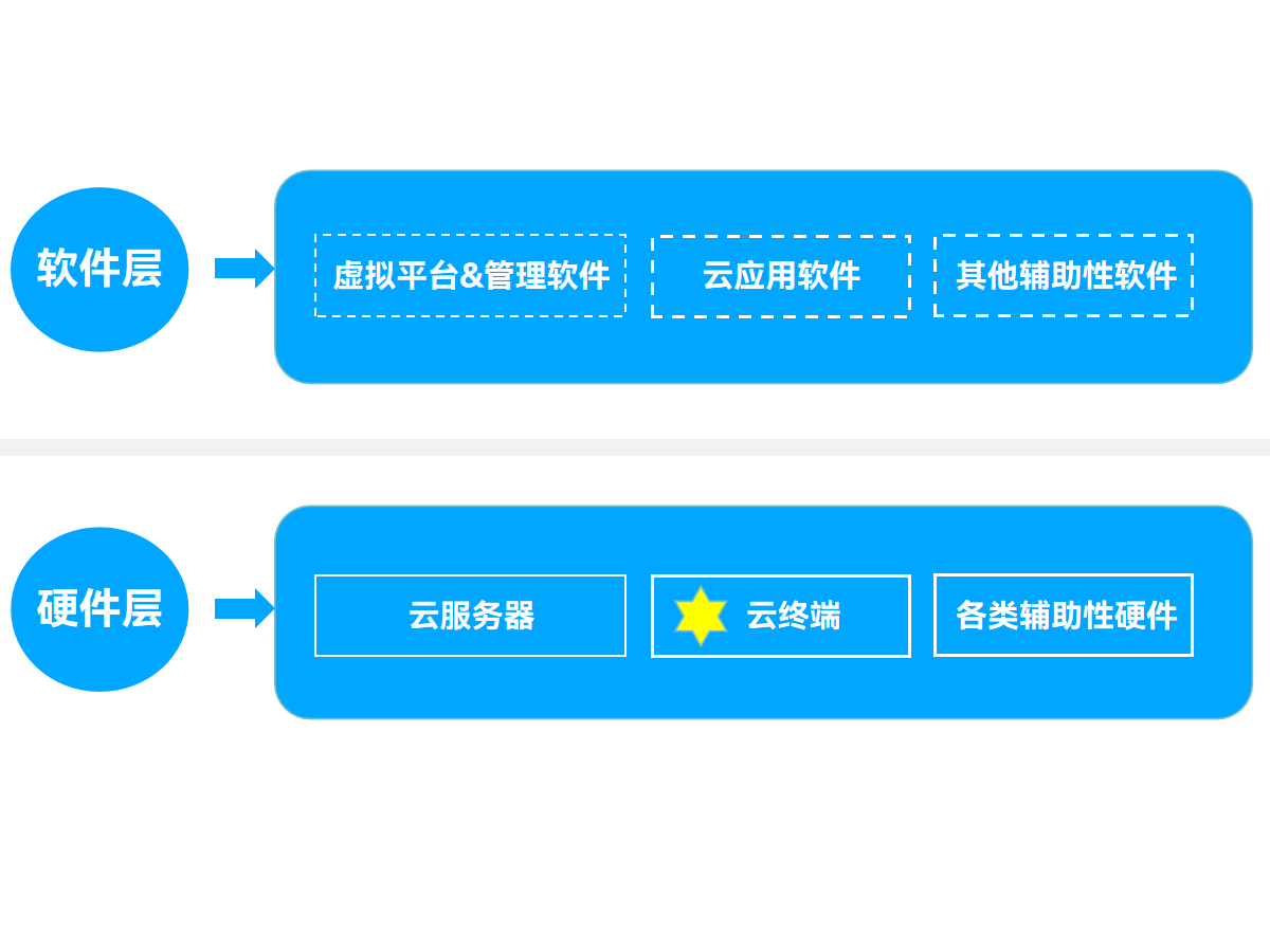 构建从芯片、操作系统的国产化云终端方案:运用虚拟化技术,用户可将桌面数据集中存储于云端服务器,并通过桌面传输协议,进行桌面分配。