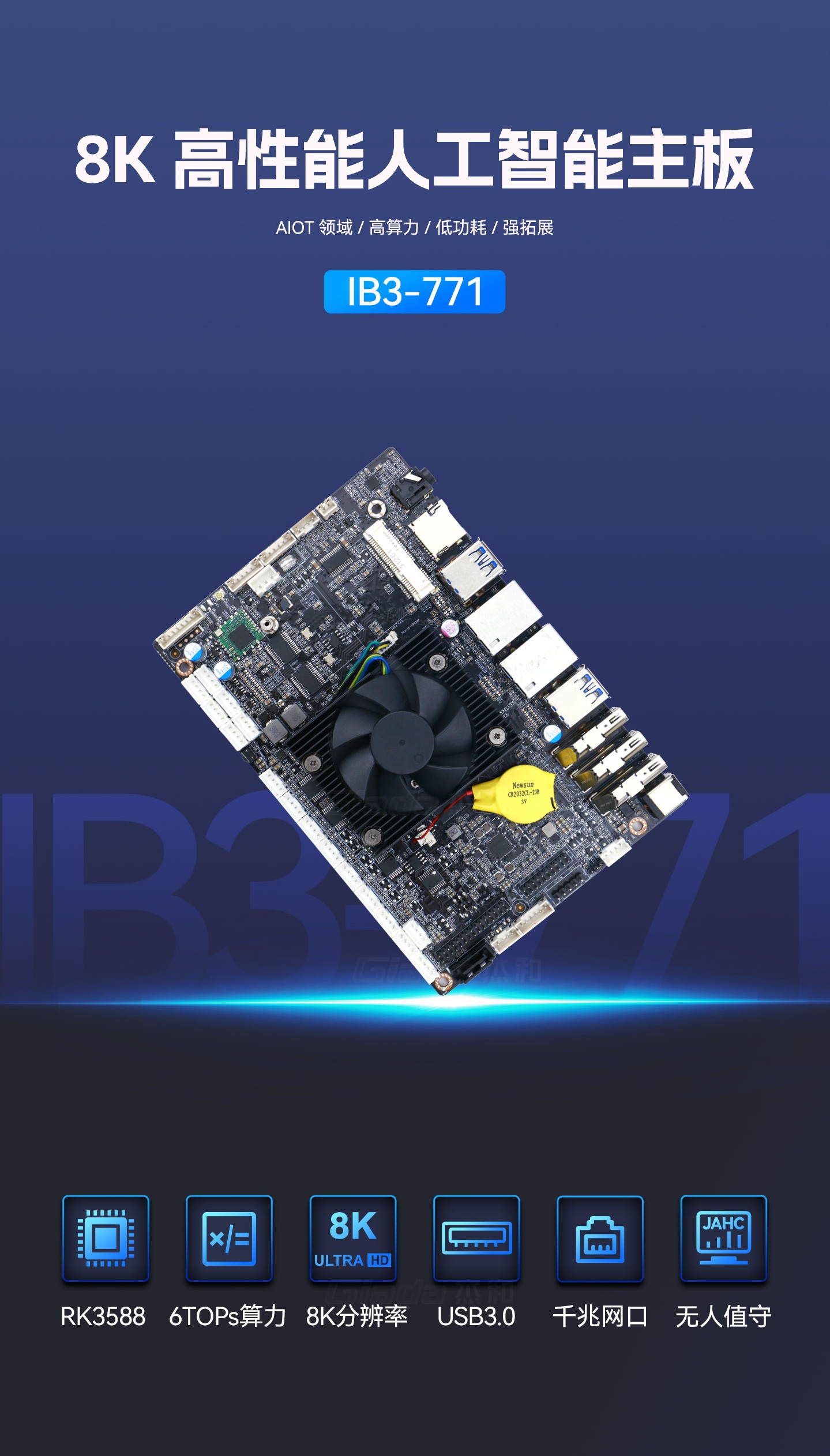 星空电竞科技IB3-771采用瑞芯微全新旗舰级芯片RK3588,搭载八核64位处理器,集成ARM Mali-G610 MP4 GPU,高算力、低功耗、具备强大的视觉处理能力;性能强悍的RK3588内置AI加速NPU,提供6TOPs算力,支持主流深度学习框架,为各类AIoT应用场景提供更优的性能表现。