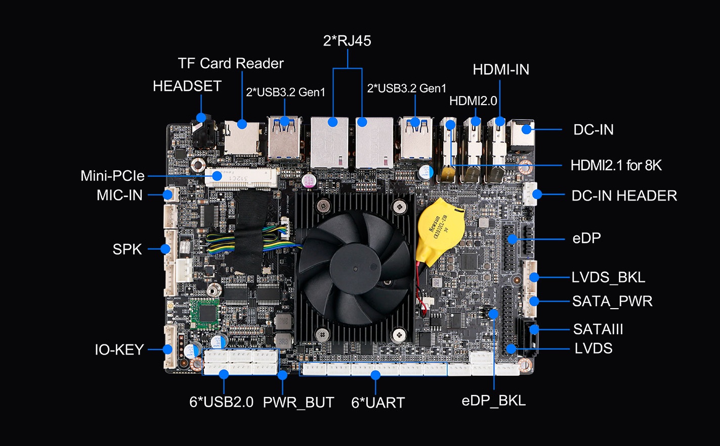 星空电竞科技IB3-771基于Rockchip瑞芯微RK3588处理器而开发,RK3588作为瑞芯微新一代旗舰级高端芯片,搭载四核A76+四核A55的八核CPU和ARMG610 MP4 GPU,内置6 TOPs算力的NPU,具有高算力、低功耗、超强多媒体、丰富数据接口等特点,CPU运算能力更强,图形处理能力方面表现出色。