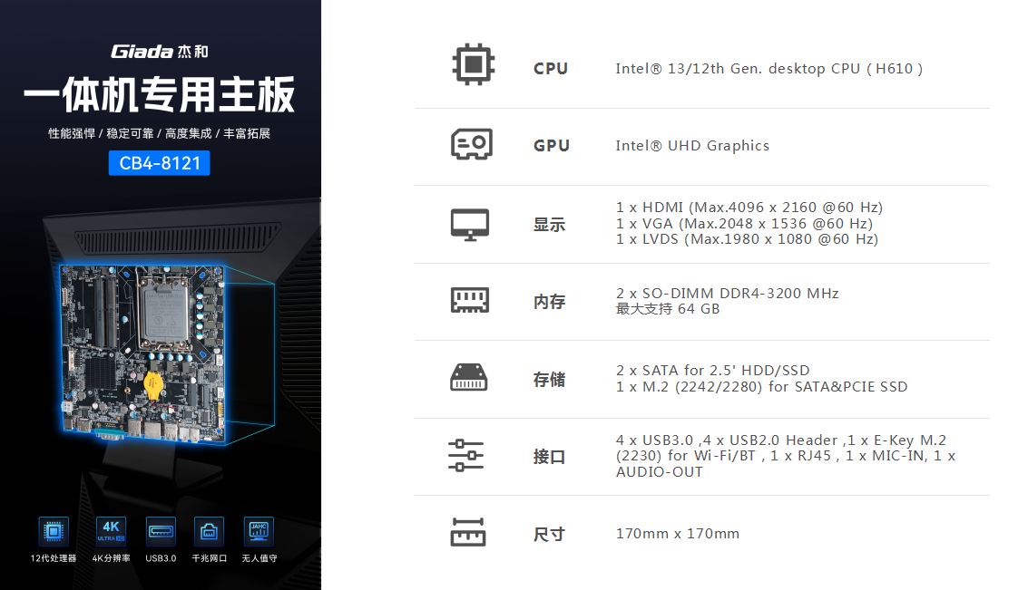 一体机在使用体验方面也有独特的优势:比笔记本屏幕大,比台式机更简洁,也解决了一直为人诟病的台式机线缆多而杂的问题,另外,随着计算机硬件和制造工艺的不断发展,一体机的性能也在不断提高,因此,越来越多的教育办公、日常娱乐和学习的用户选择使用一体机。Giada星空电竞科技根据市场与客户需求,推出这款高性能的一体机专研主板CB4-8121,带来全新震撼体验。