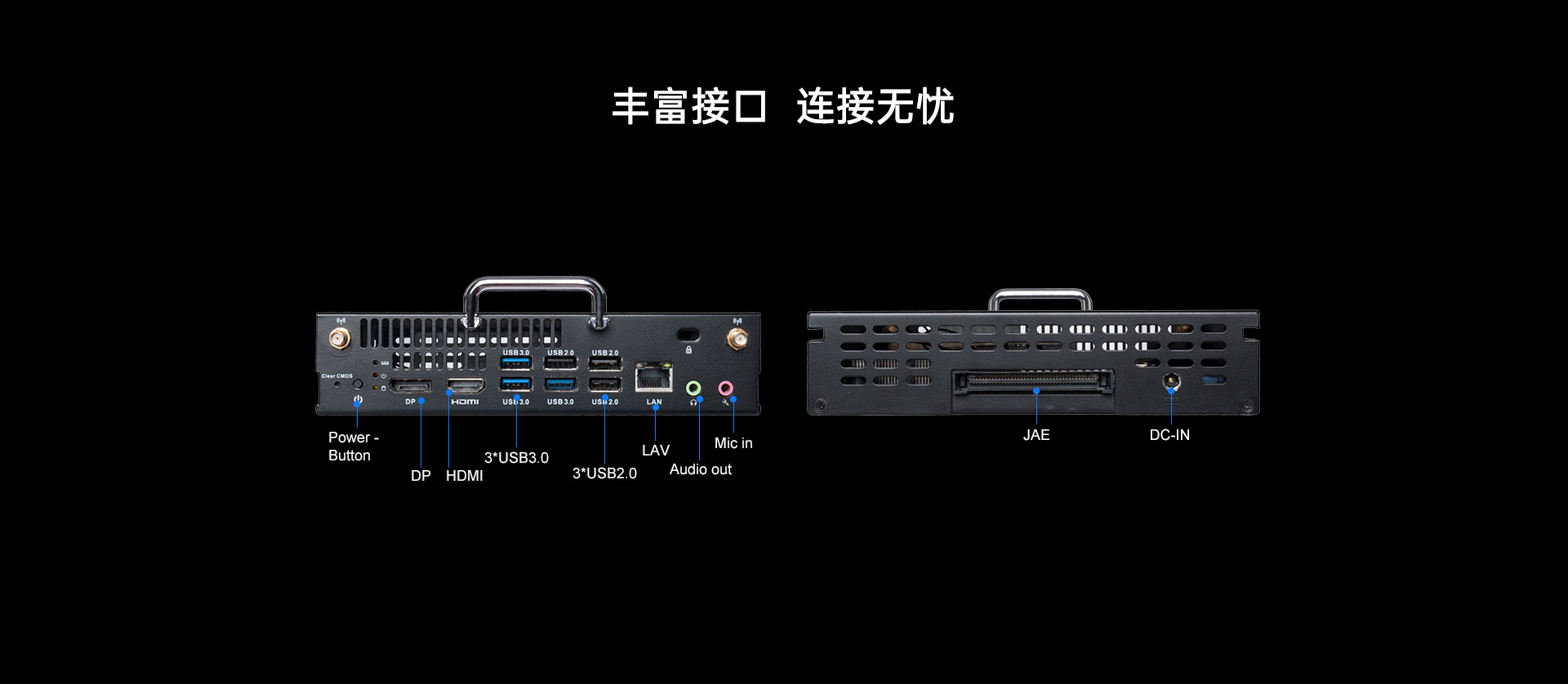 | 视频接口 | 1 x HDMI (Max. 4096 x 2160@60Hz) 1 x DP (Max. 4096 x 2304@60Hz) JAE端:1 x HDMI (Max. 4096 x 2160@60Hz) | |